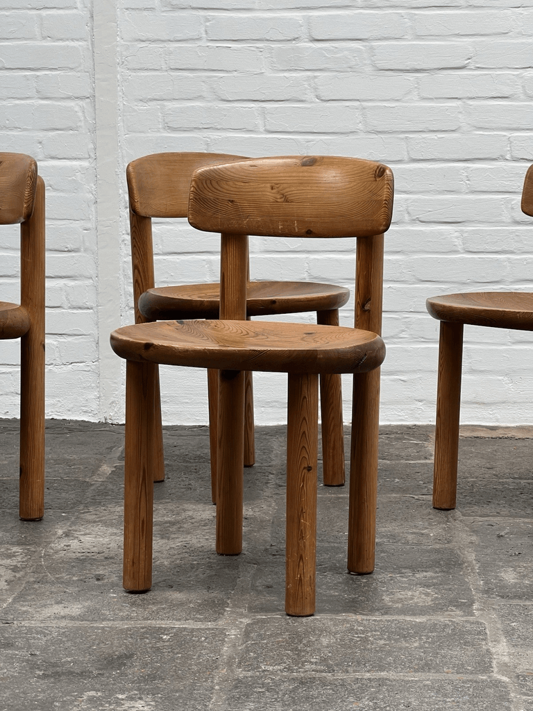 Beautiful and rare Chairs with tilting back designed by Rainer Daumiller in solid pine wood, this set features beautiful patina and timeless Scandinavian design.