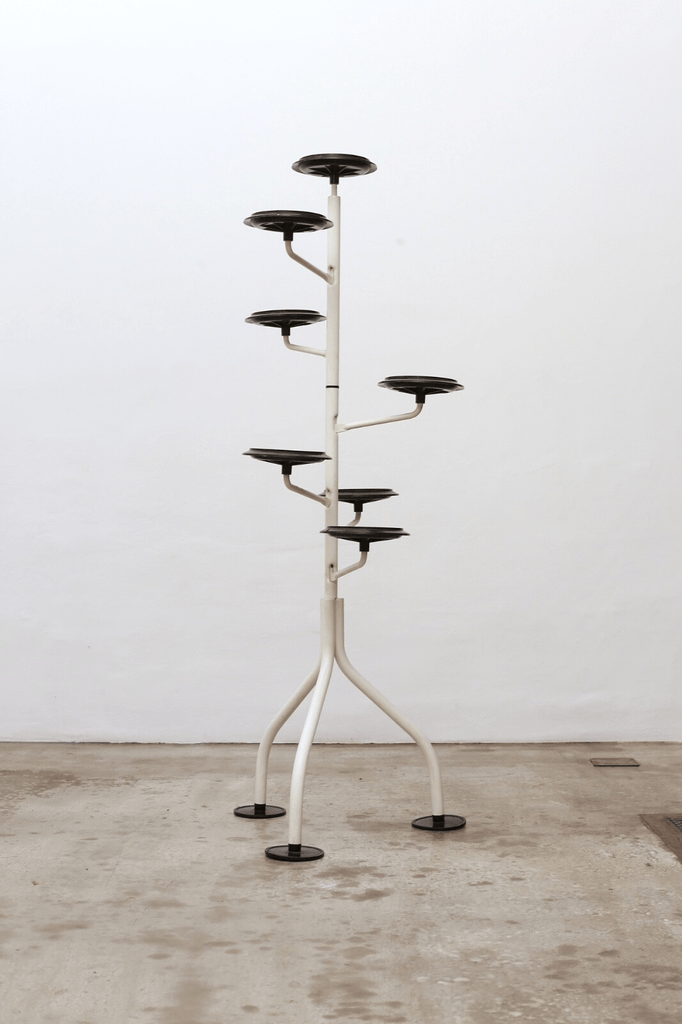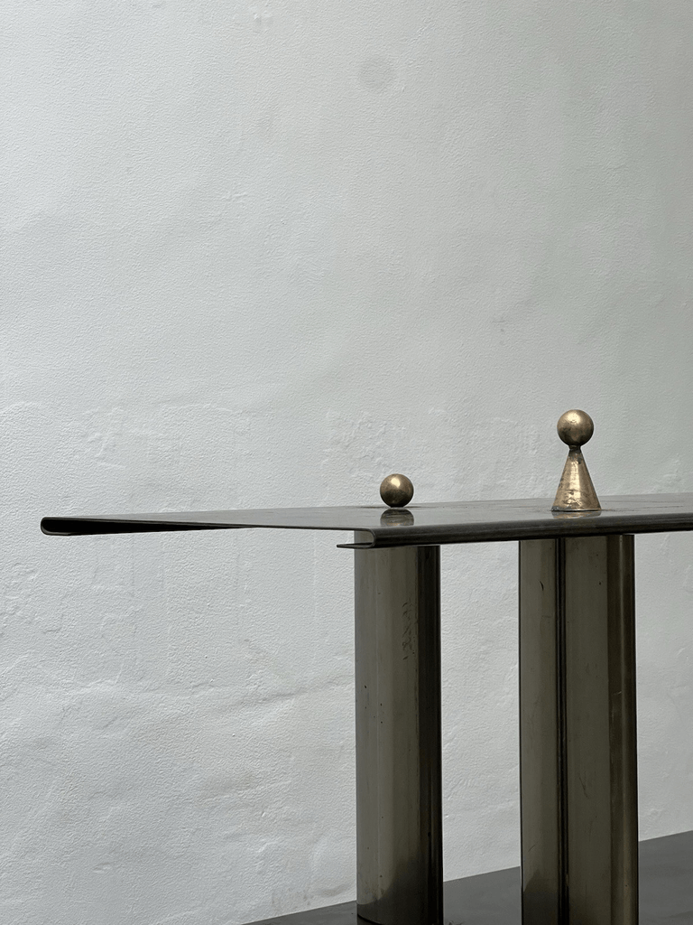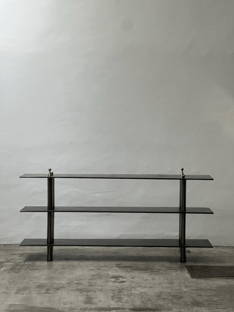 Rare and unique postmodern steel console shelf with strong graphic lines and open storage, acting as a sculptural focal point in a hallway or living room.