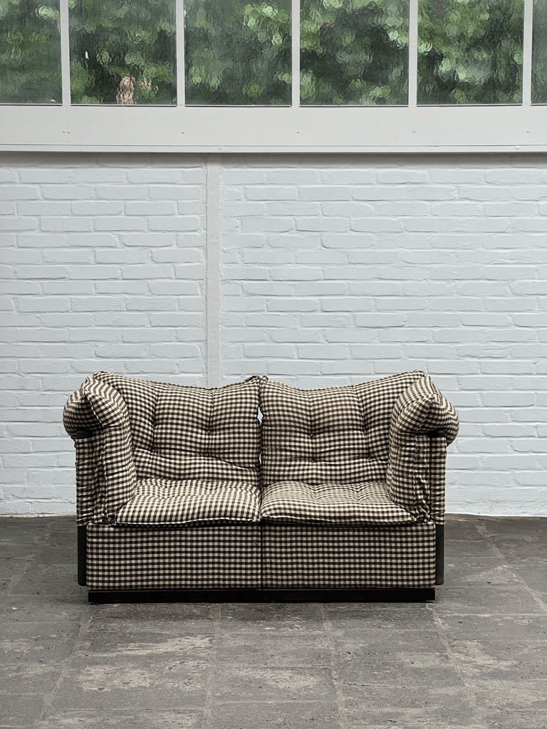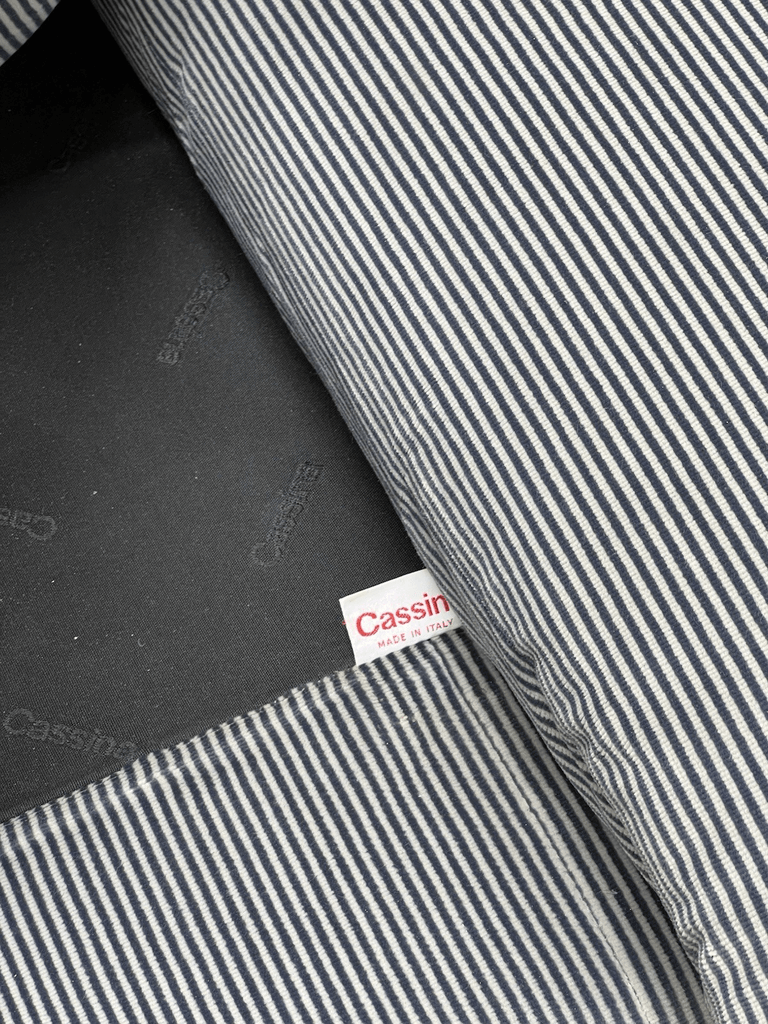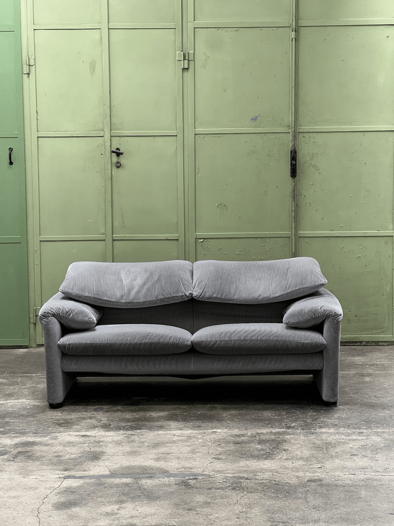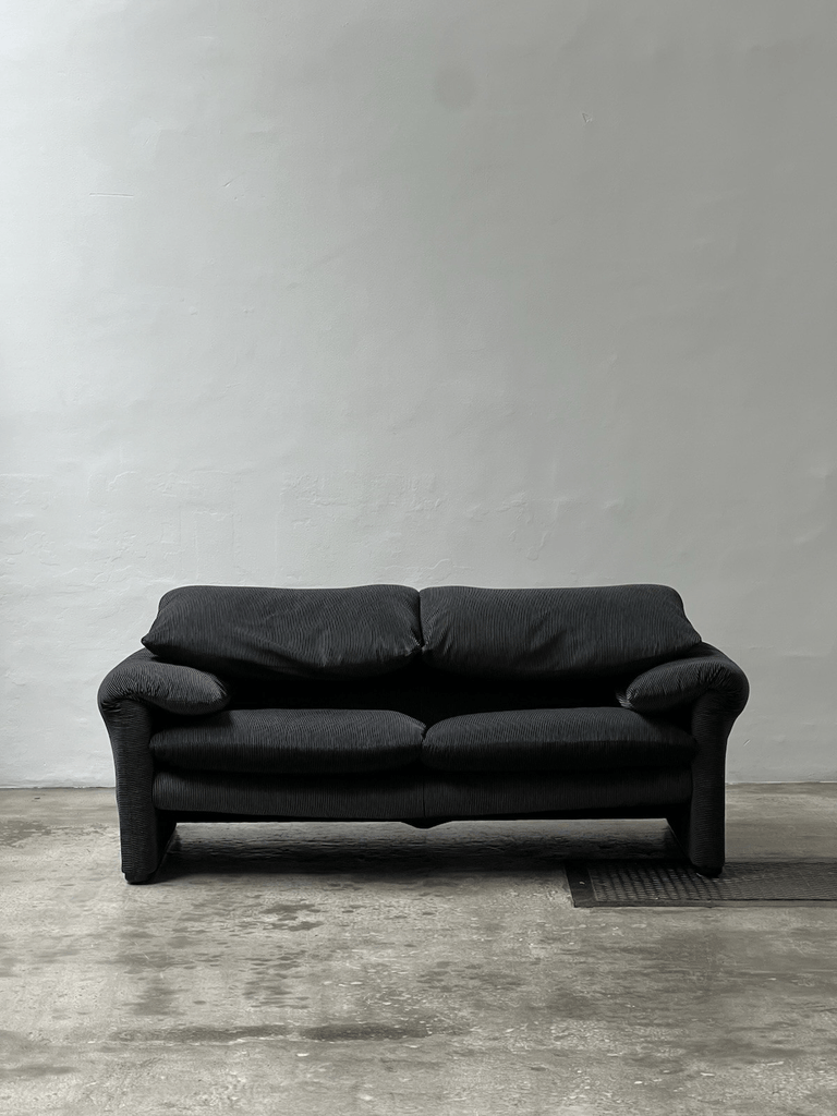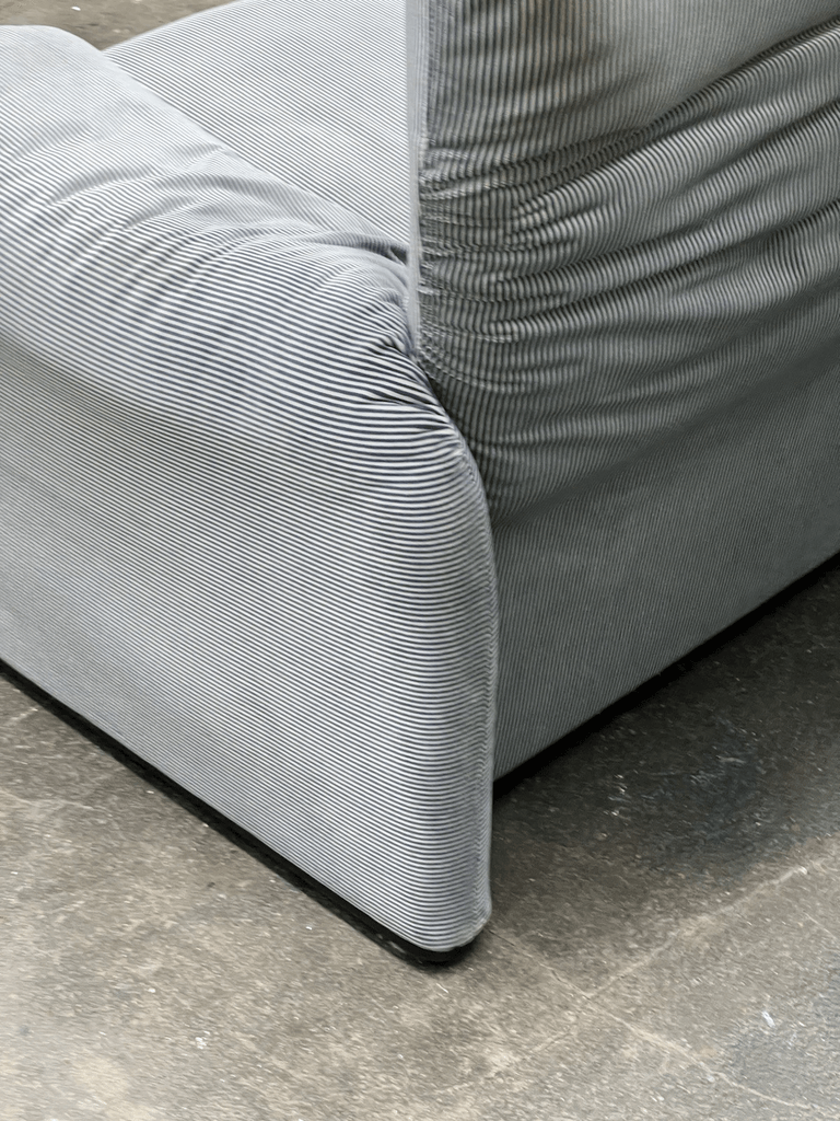 Maralunga 2 seater sofa in striped original fabric designed by Vico Magistretti manufactured in Italy by Cassina.