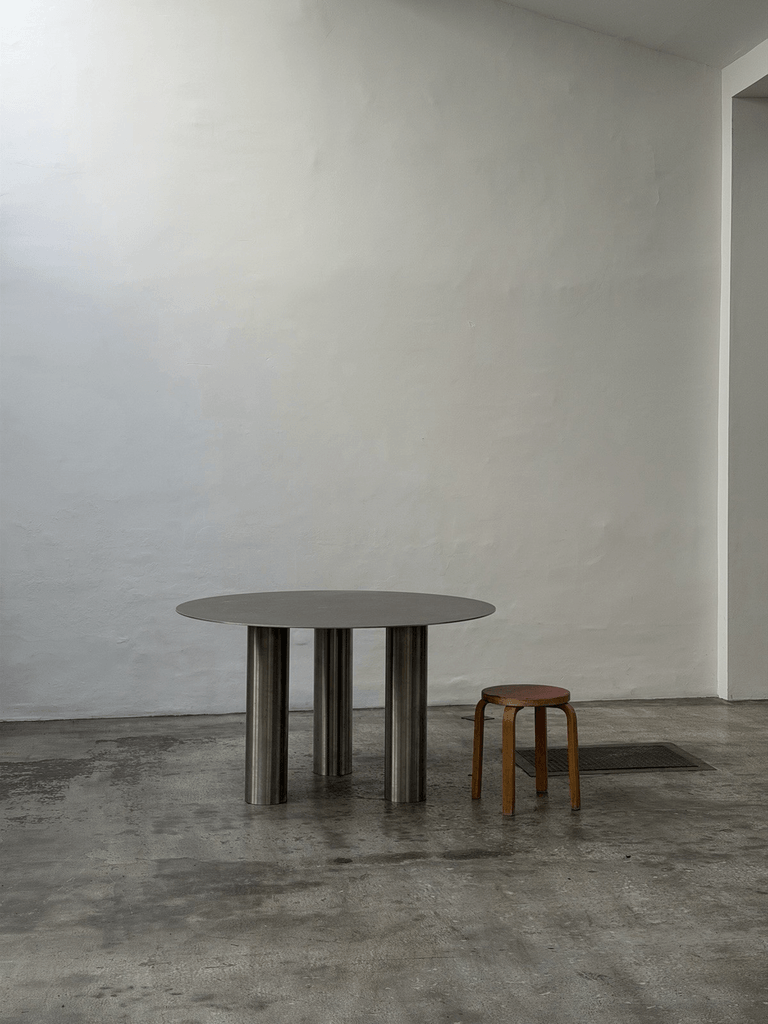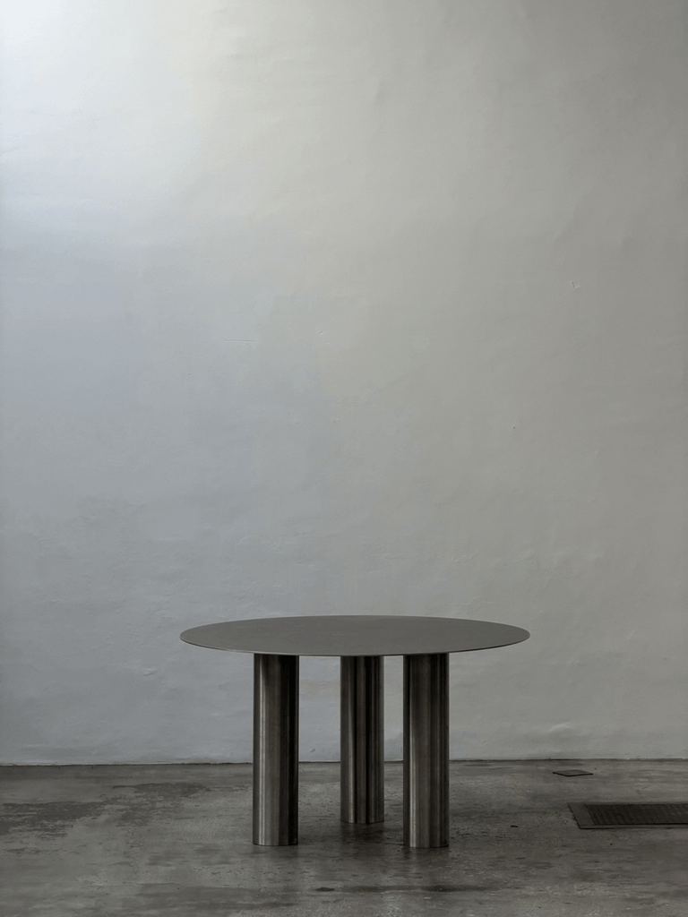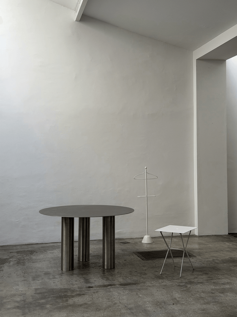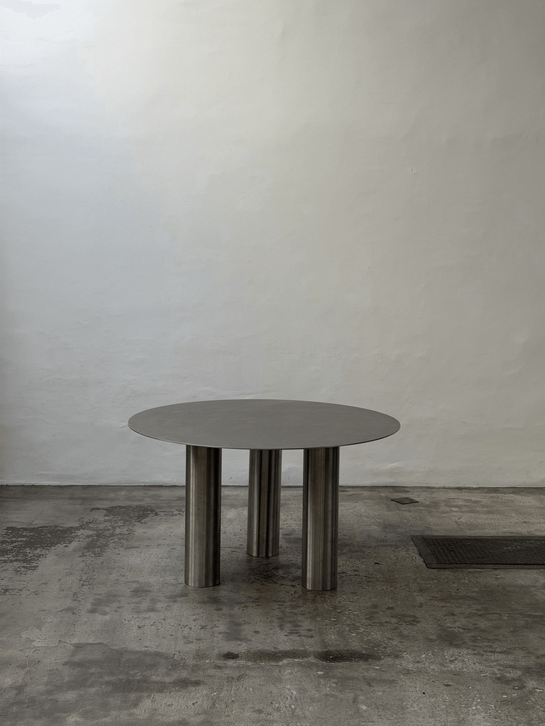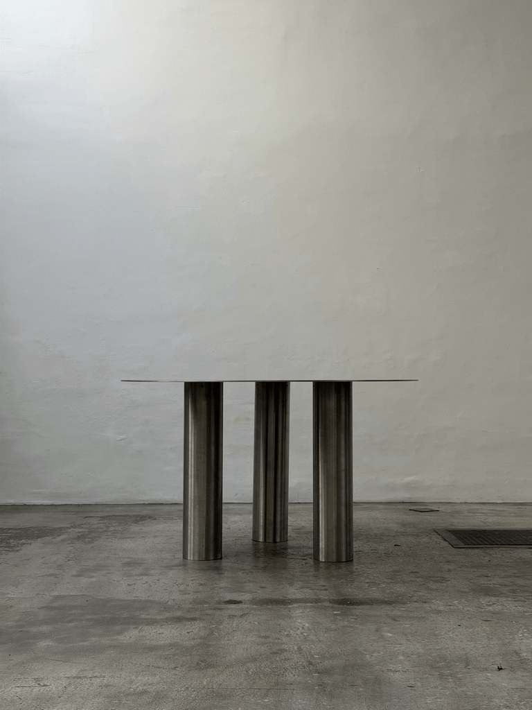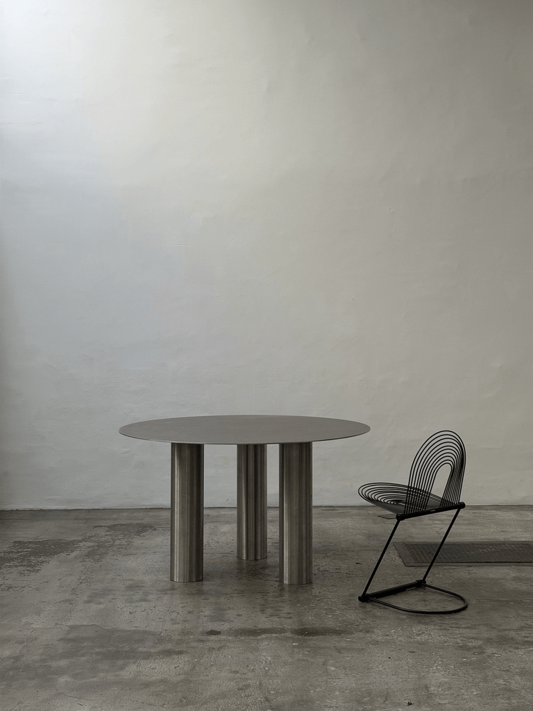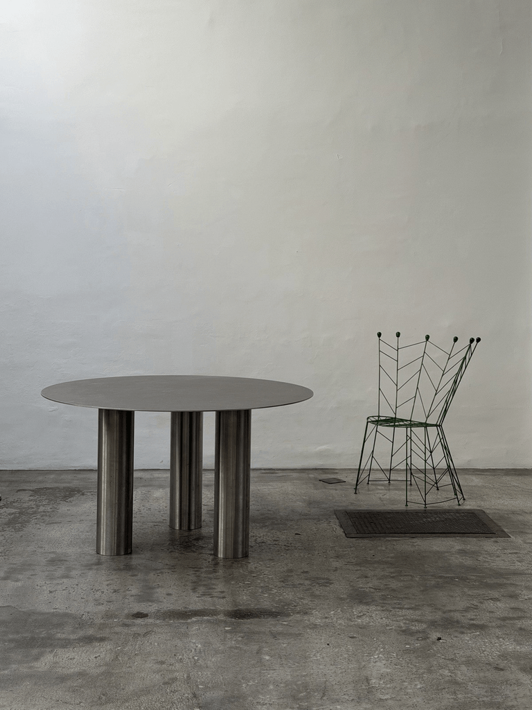Sculptural unique steel dining table featuring a striking postmodern design with bold geometric presence and architectural character.
