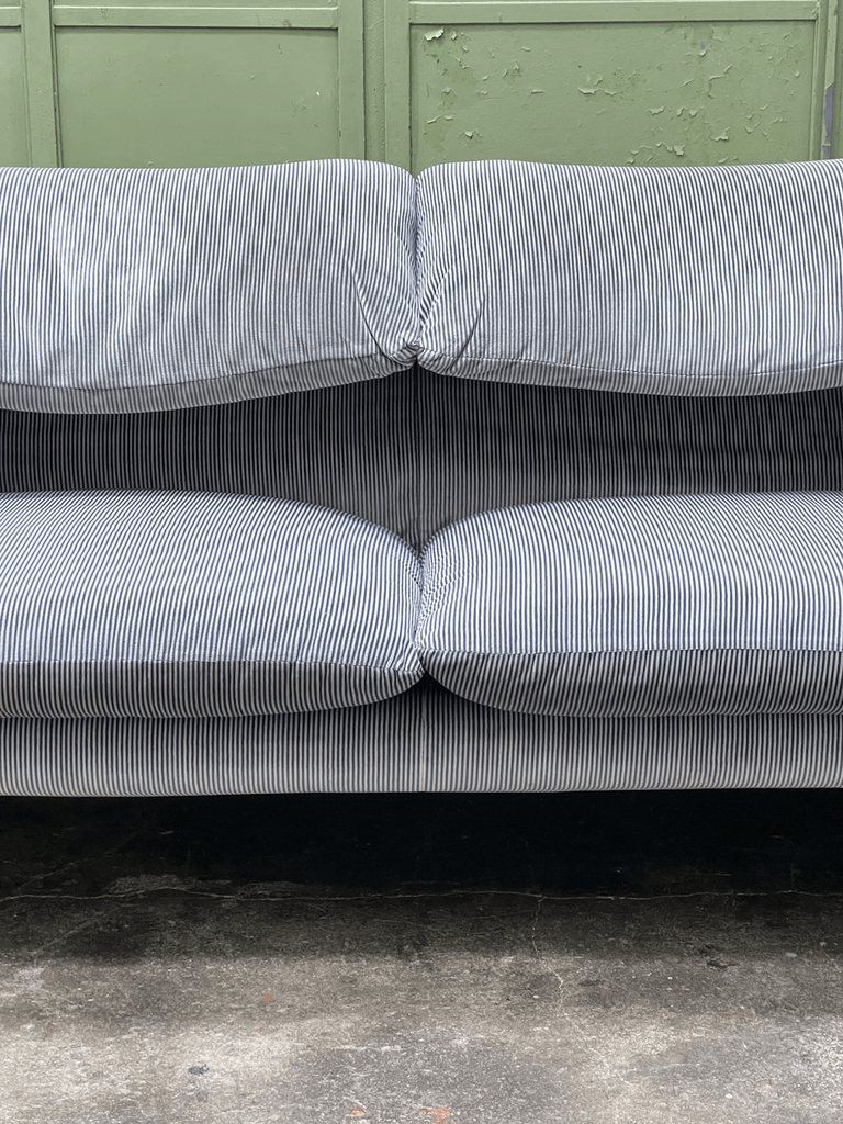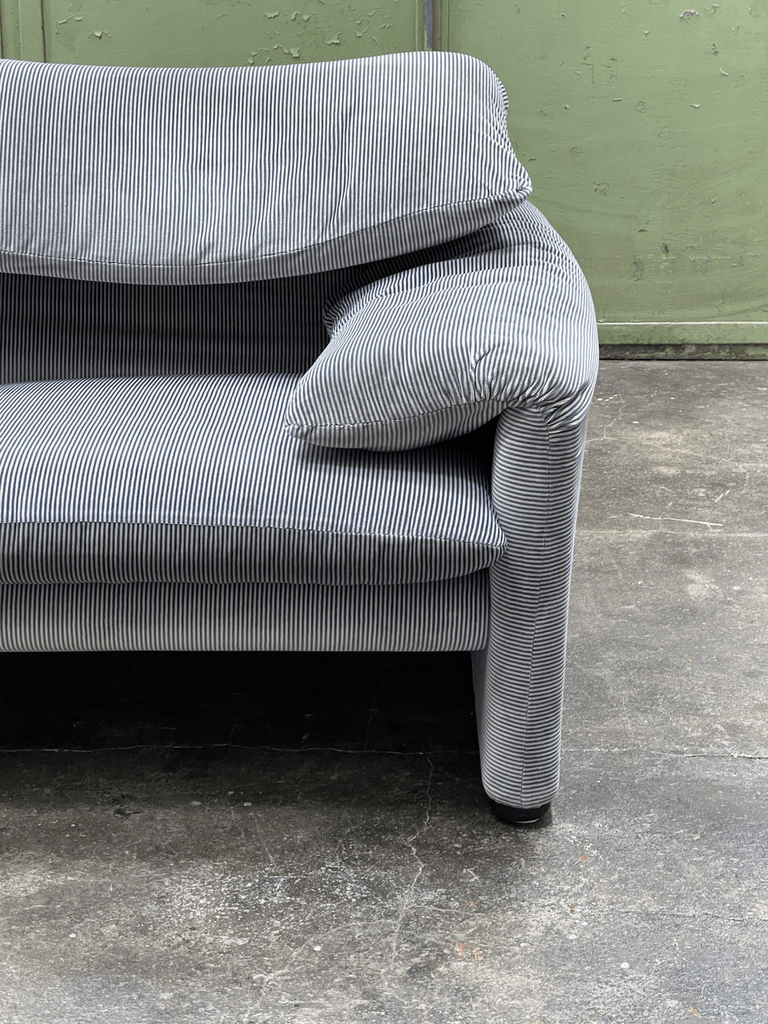 Maralunga 2 seater sofa in striped original fabric designed by Vico Magistretti manufactured in Italy by Cassina.
